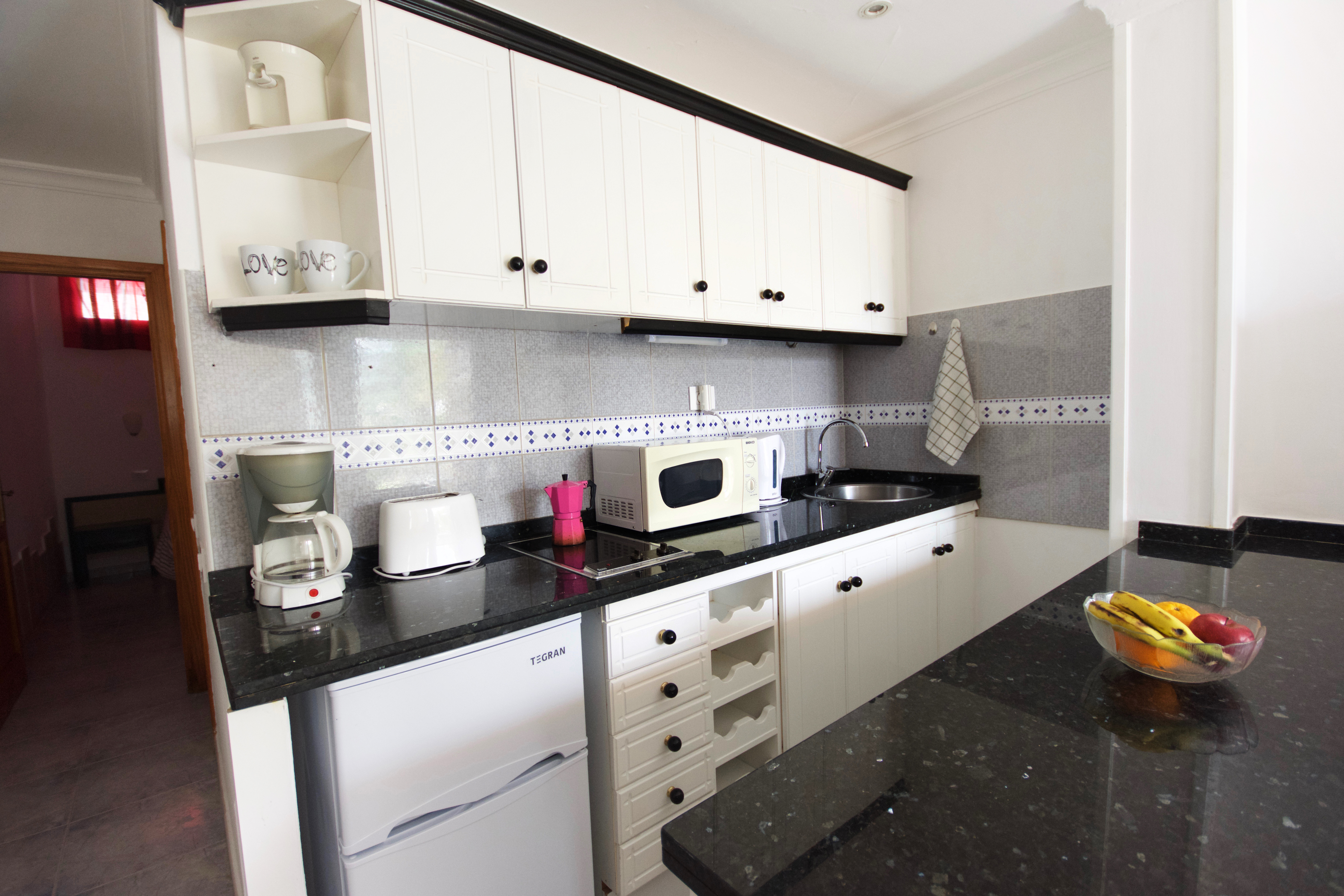 - Cocina americana, equipada con vitrocerámica, microondas, nevera, cafetera, etc.